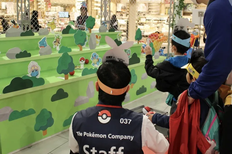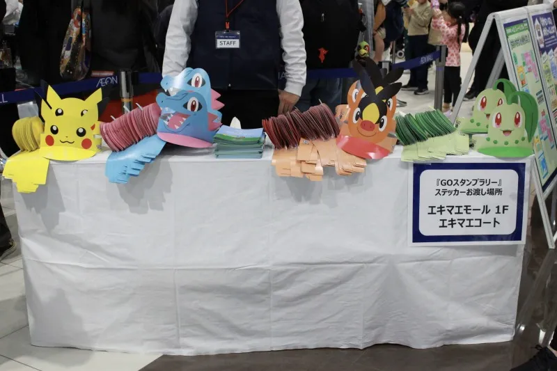 期間中は「ピカチュウ」「チコリータ」「ポカブ」「ワニノコ」のサンバイザーを無料でもらうことができる。「GO スタンプラリー」では、「ポケストップ」を訪れて、4か所すべてのスタンプを集めると、ステッカーがプレゼント。館内では、ピカチュウなどのサンバイザーを身につけた来場者がスタンプを集めたり、とっくんメニューを楽しむ姿が見られた。
