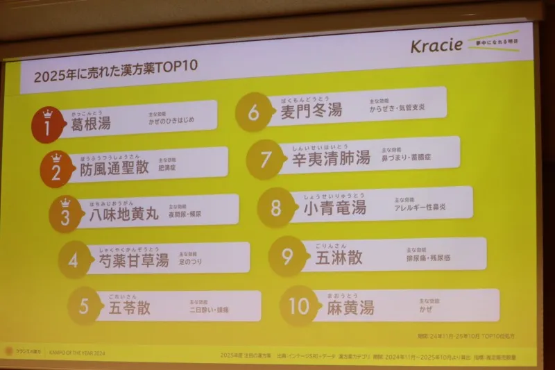 続いて、ヘルスケア事業部マーケティング部課長の砂橋久瑠実氏より、2025年に売れた漢方薬TOP10が発表。今年は統計開始以来最も暑い夏となり、例年より長引く猛暑の影響で、ニキビや熱中症に関連する処方が大幅に伸びた。その一方で、空梅雨の影響により、気象病やむくみ症状に効く漢方の処方は縮小したという。