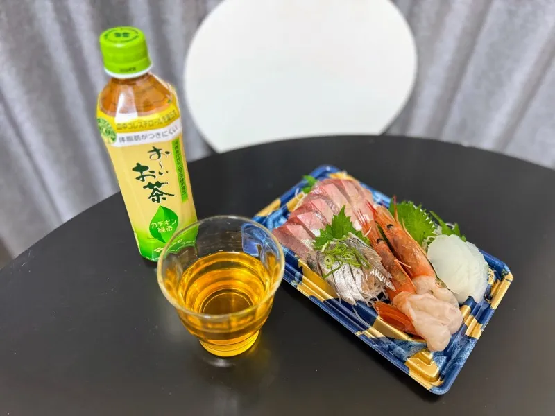 トクホのお〜いお茶のほんのりとした苦味がお刺身のまろやかさを強調し、それぞれをさらにおいしく感じさせてくれるような組み合わせでした。