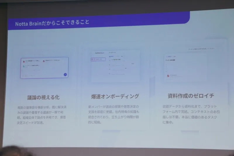 特徴は、単なる要約にとどまらず、複数の会議をまたいだ論点整理や、過去の意思決定の文脈理解までを支援する点にある。発表会のデモでは、建設会社の複数議事録を読み込み、中途入社メンバー向けのオンボーディング資料を数分で生成する様子が披露された。プロジェクトの背景、重要な発言、社内特有の用語まで網羅された資料は、来場者の関心を集めた。