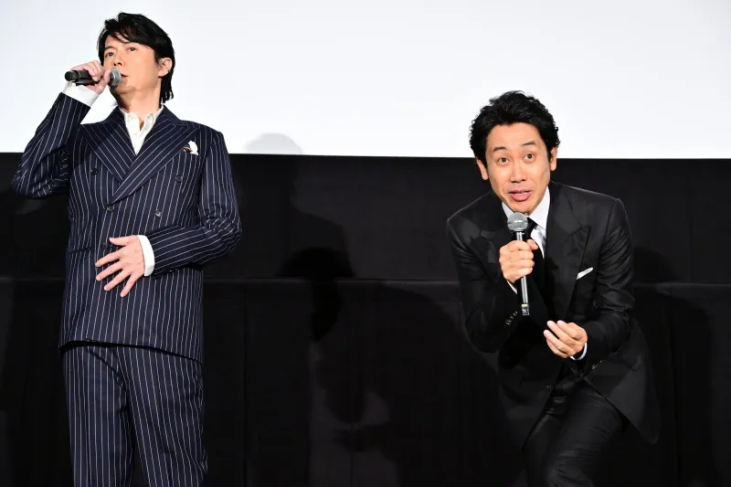 大立ち回りのアクションシーンも見どころの本作だが、大泉は「ガンアクションがあると言われて弾丸の装填の練習を散々して現場に行ったら『ここは肉弾戦で』と突然初日に言われて…。とにかく肉離れを起こさない事だけを考えてやっていました。大けがだけには気を付けて」と公開ボヤキ。一方、福山はあざだらけの撮影を回想し「脚本に書いていない最後の決め技は自分から提案をさせていただきました。普段滅多に技を決める事もないので、いつも好きで観ている格闘技の重要な決め技をやっていいですか?とリクエストしました」と舞台裏を明かした。