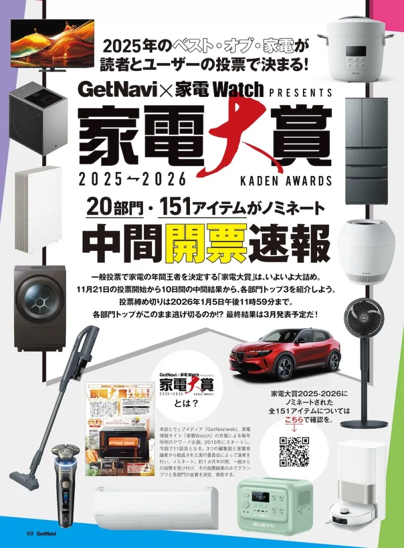 また、第2特集は「家電大賞2025-2026 中間開票速報」。一般投票で家電の年間王者を決定する「家電大賞」もいよいよ大詰めに。11月21日の投票開始から10日間の間に集計された中間開票結果を発表。各部門でスタートダッシュを決めたトップ3の家電が明らかになっています。