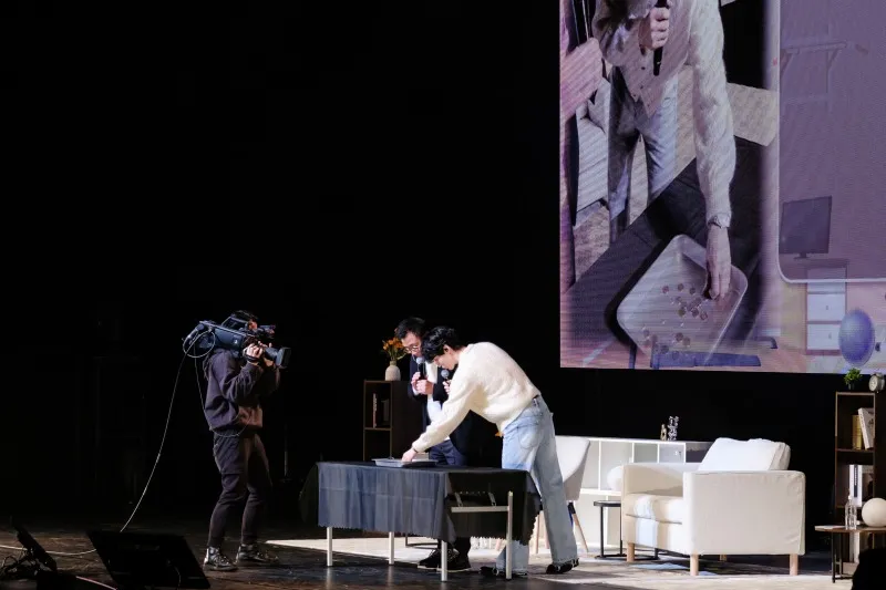 温かな拍⼿に包まれるなかで姿を⾒せたイ・ドンウクは、笑顔で挨拶し観客を⼀気に沸かせました。冒頭では、会場に『殺し屋たちの店』シーズン2で共演した岡⽥将⽣からの花束が届いていたことについて、「写真を撮ってメッセージを送りました。でも、返事がありません。番号がわからなかったのかな」と話し、観客を笑わせて会場を和ませていました。
