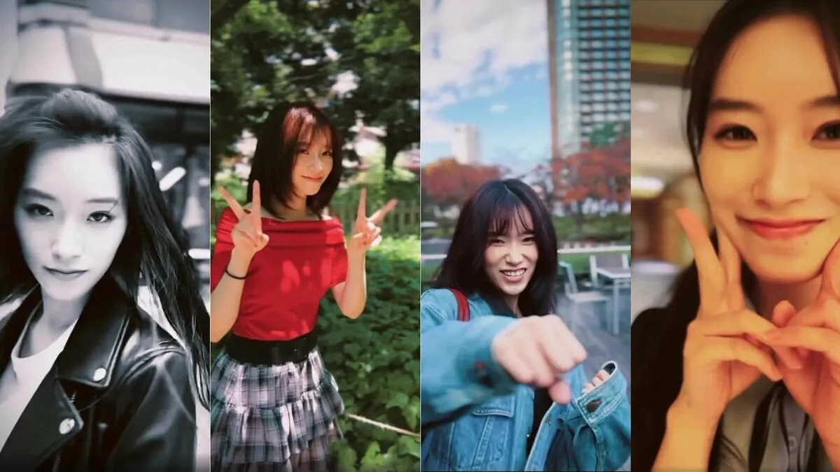 その後は、赤の半袖ブラウスにグレーのチェックのミニで夏の木漏れ日の中を歩くカットや、グレーのパーカーをラフに着て鏡に向かって自撮りしたり、ダウンジャケットで横断歩道を闊歩したり、半袖Tシャツでアイスクリームを食べたりと、順番も関係なく様々なカットをBGMのビートに乗せてつないでいます。