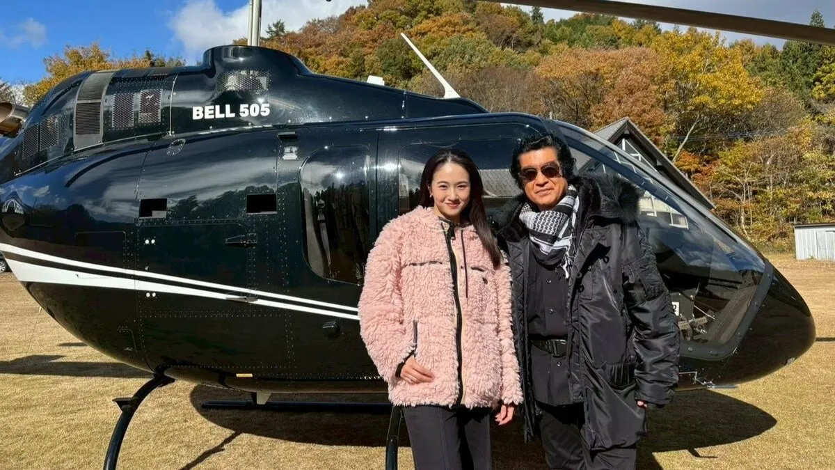 愛さんは、大きめのサングラスをかけた父・弘、さんと共に、漆黒のヘリコプターの前で並んで撮った2ショット写真を投稿。まるで、アクション映画の始まりのような精悍さの漂う写真となっています。