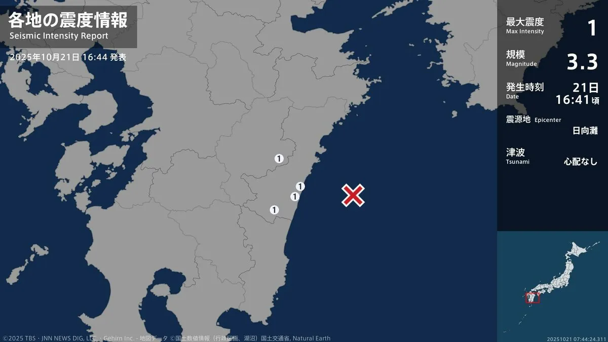 気象庁によりますと、震源地は日向灘で、震源の深さはおよそ30km、地震の規模を示すマグニチュードは3.3と推定されます。