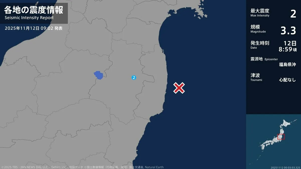 12日午前8時59分ごろ、福島県で最大震度2を観測する地震がありました。