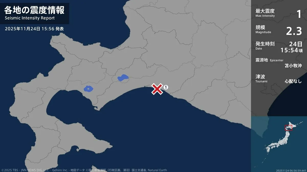 24日午後3時54分ごろ、北海道で最大震度1を観測する地震がありました。