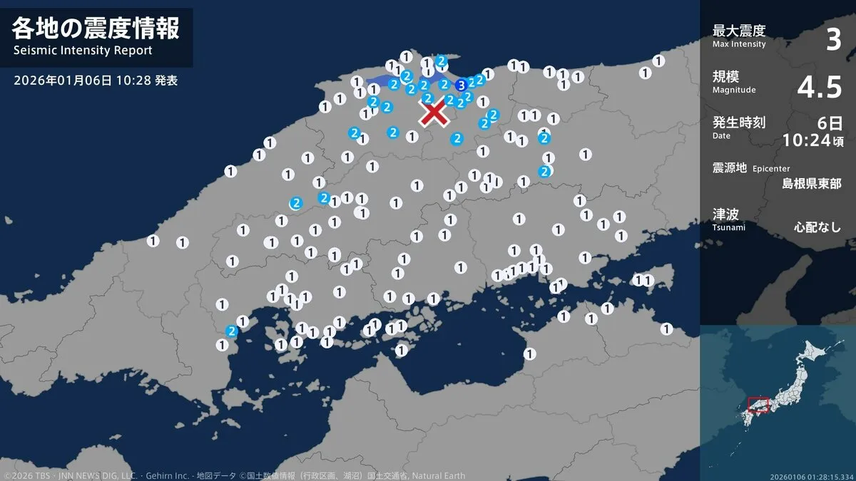 気象庁によりますと、震源地は島根県東部で、震源の深さはおよそ10km、地震の規模を示すマグニチュードは4.5と推定されます。