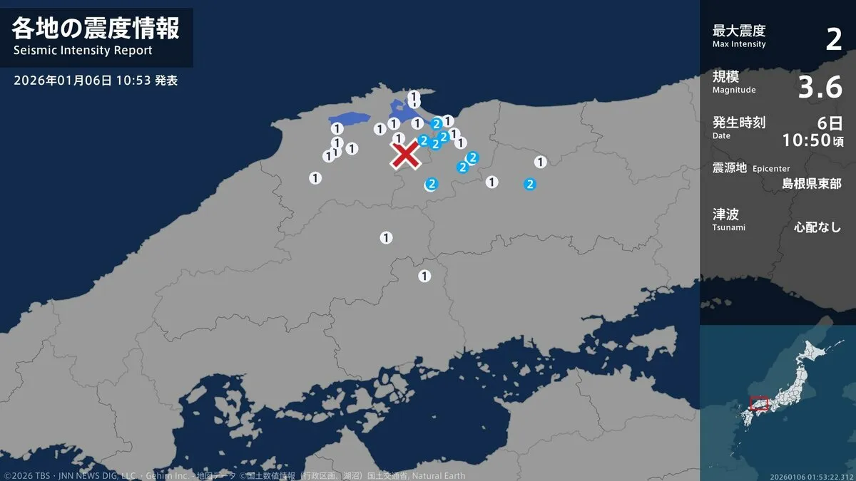 気象庁によりますと、震源地は島根県東部で、震源の深さはおよそ10km、地震の規模を示すマグニチュードは3.6と推定されます。