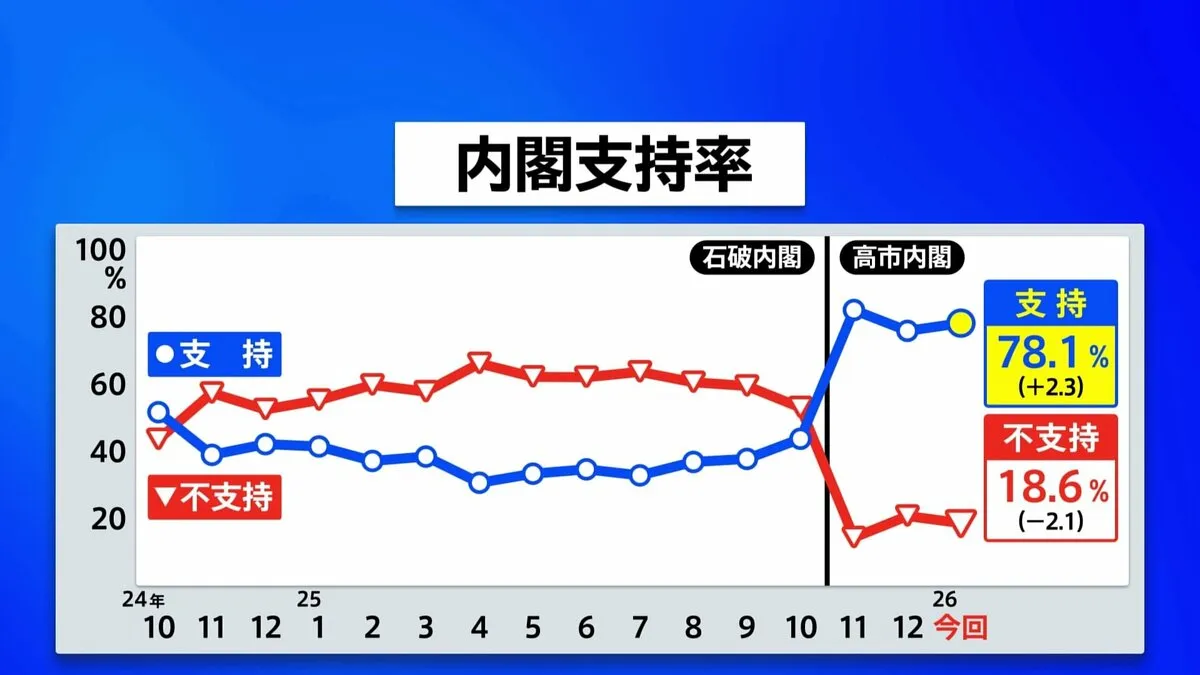 高市内閣を「支持できる」という人は、先月の調査より2.3ポイント上昇し、78.1%でした。一方、「支持できない」という人は2.1ポイント下落し、18.6%でした。