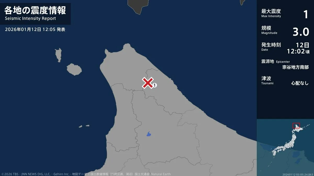 12日午後0時2分ごろ、北海道で最大震度1を観測する地震がありました。