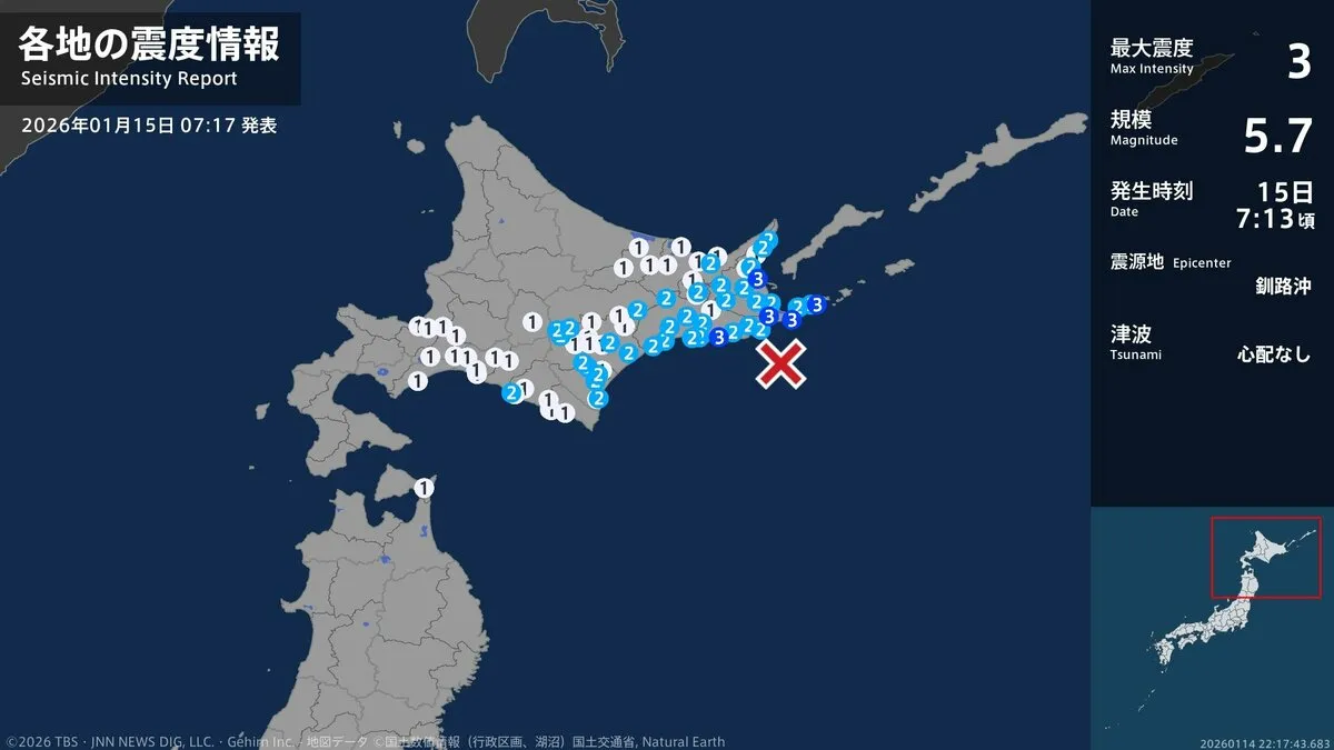 15日午前7時13分ごろ、北海道で最大震度3を観測する地震がありました。