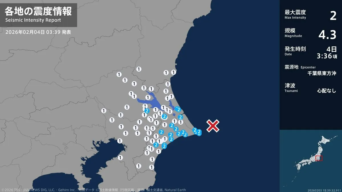 気象庁によりますと、震源地は千葉県東方沖で、震源の深さはおよそ30km、地震の規模を示すマグニチュードは4.3と推定されます。