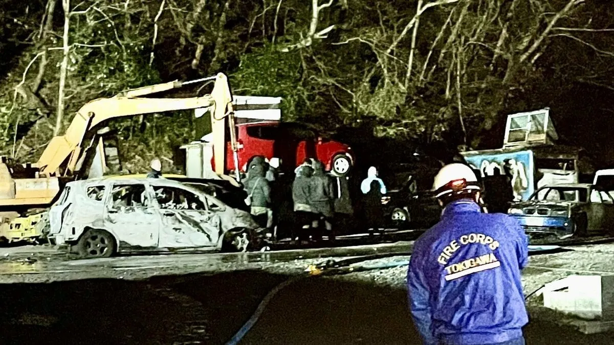 この火事で、車を解体する会社の敷地内にあるプレハブの建物1棟と廃棄予定だった車数十台が焼けたほか、火は隣接する山林にも燃え移りましたが、消防車14台が出動して消火活動にあたり、およそ2時間後に、燃え広がる恐れはなくなったということです。