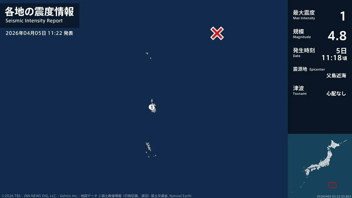 気象庁によりますと、震源地は父島近海で、震源の深さはおよそ10km、地震の規模を示すマグニチュードは4.8と推定されます。