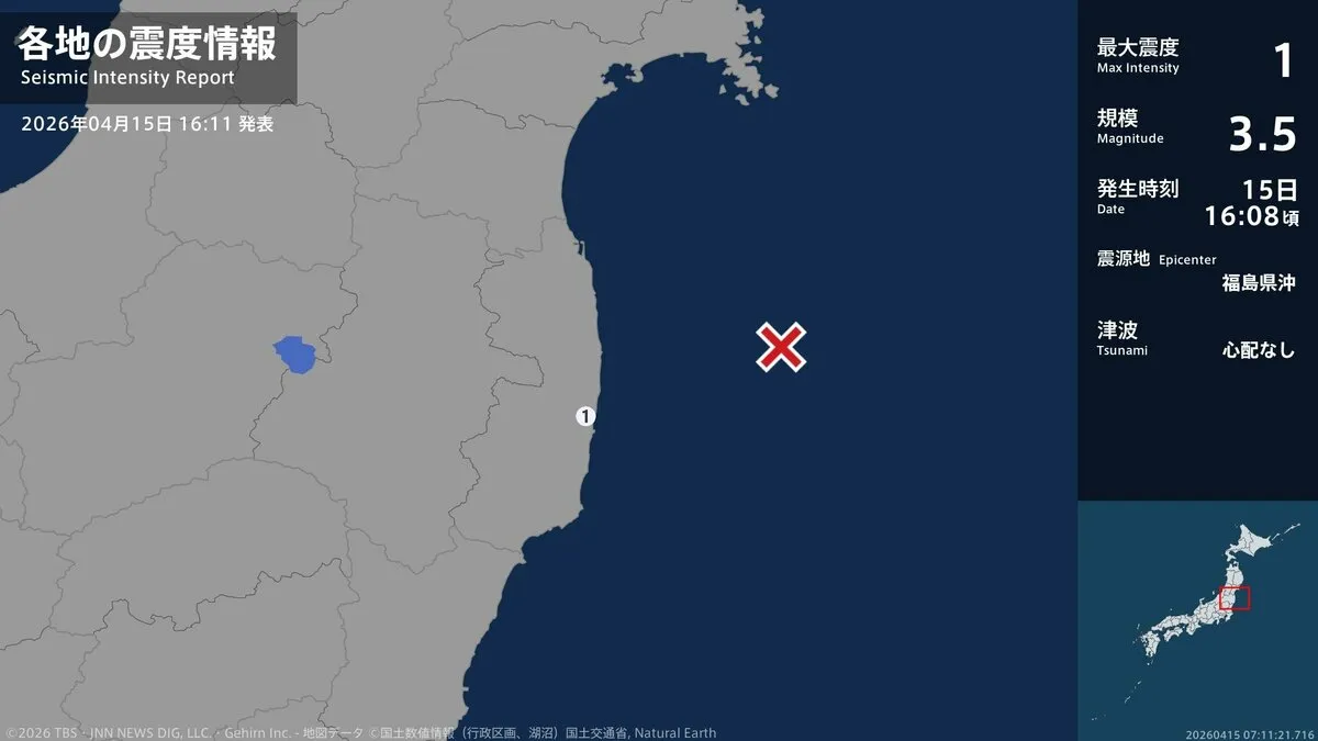 15日午後4時8分ごろ、福島県で最大震度1を観測する地震がありました。