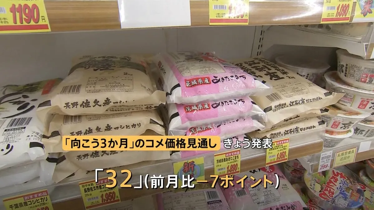 高止まりが続くコメですが、ついに下がるかもしれません。きょう発表された「向こう3か月」の価格見通しは前の月から7ポイント下落の「32」。先高・先安観の分かれ目となる「50」を大幅に下回りました。