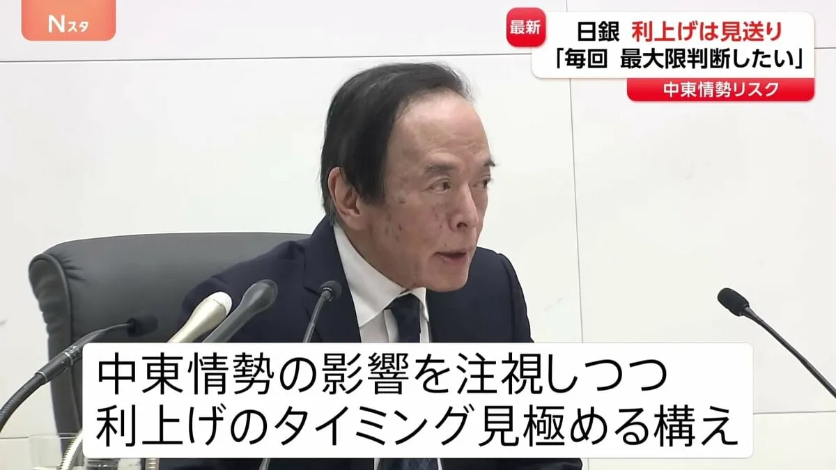 日本銀行はきょう追加の利上げを見送り、政策金利の維持を決めました。今後は緊迫化する中東情勢の影響を注視しつつ、利上げのタイミングを模索する方針です。