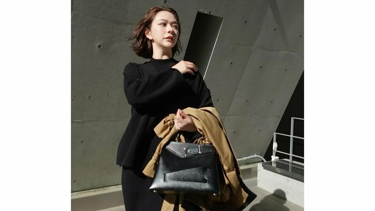 投稿された写真には、黒いセーターを着た村重さんがベージュのコートを腕に掛け、黒いバッグを持った姿が写っています。