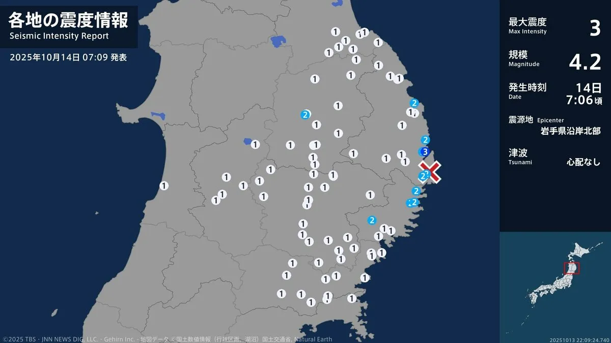 14日午前7時6分ごろ、岩手県で最大震度3を観測する地震がありました。