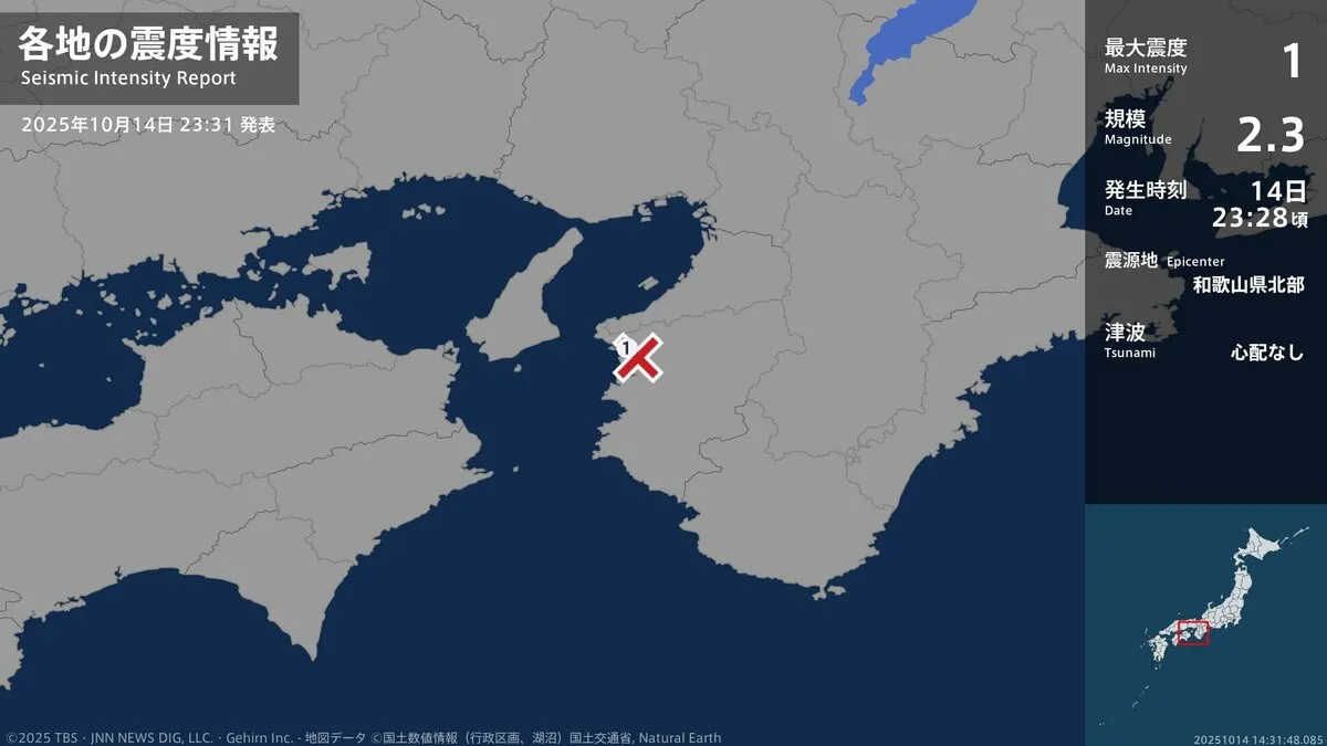14日午後11時28分ごろ、和歌山県で最大震度1を観測する地震がありました。