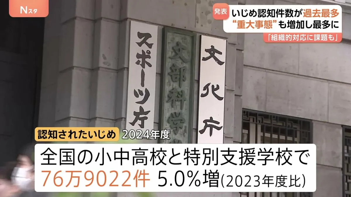 文部科学省は、2024年度に全国の小中高校と特別支援学校で認知されたいじめは前の年度より5.0%増加し、76万9022件だったと発表しました。