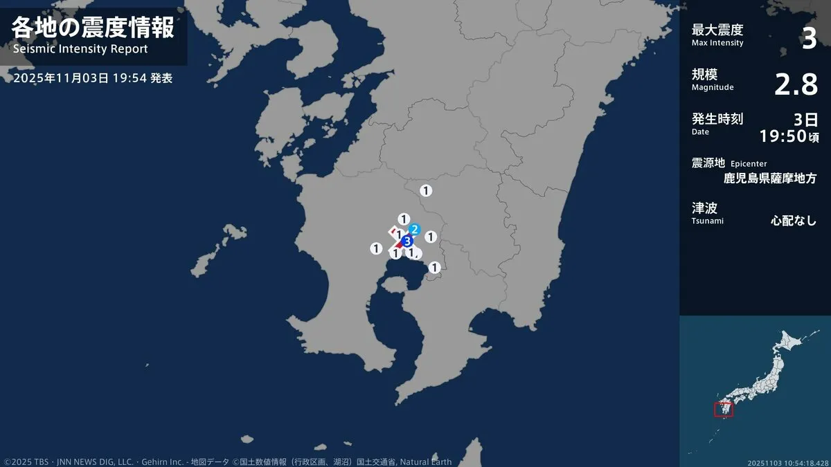 3日午後7時51分ごろ、鹿児島県で最大震度3を観測する地震がありました。