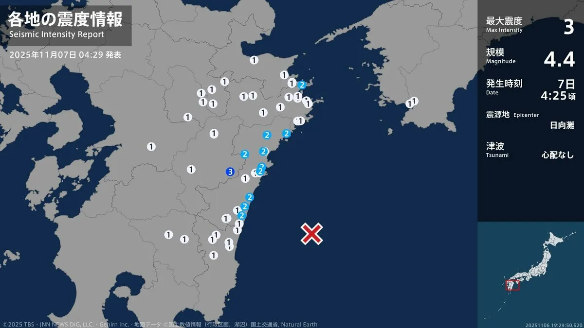 7日午前4時26分ごろ、宮崎県で最大震度3を観測する地震がありました。