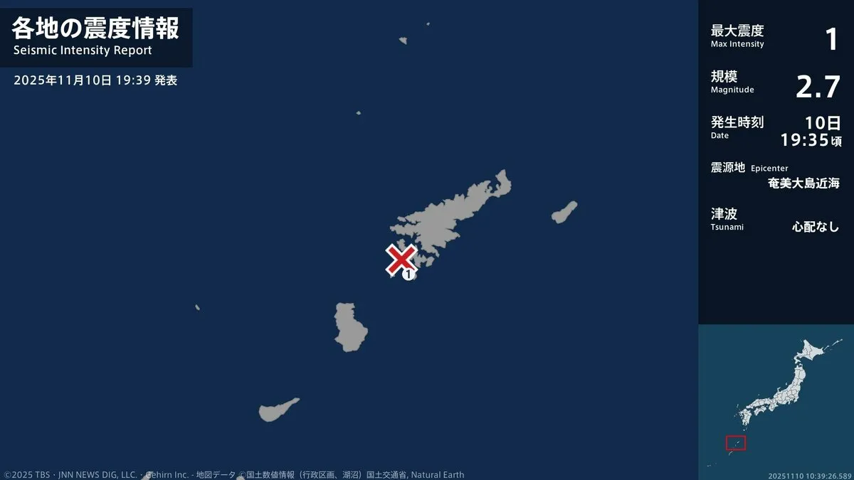 気象庁によりますと、震源地は奄美大島近海で、震源の深さはおよそ20km、地震の規模を示すマグニチュードは2.7と推定されます。