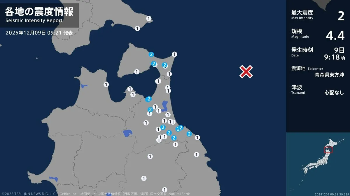 9日午前9時18分ごろ、青森県で最大震度2を観測する地震がありました。