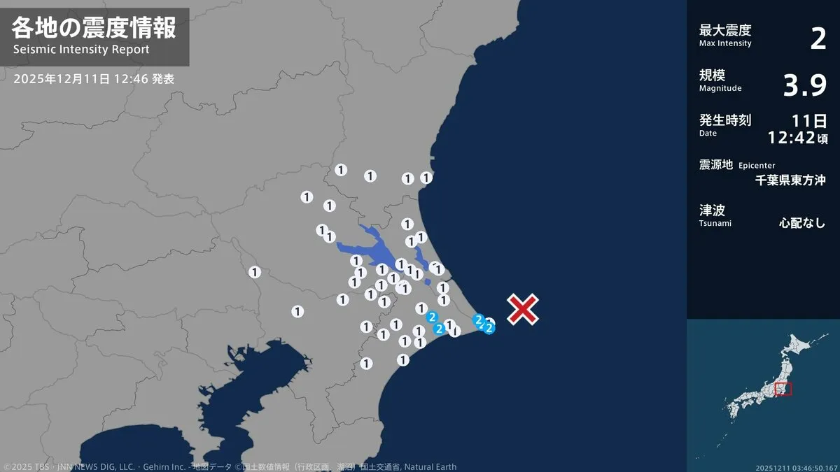 気象庁によりますと、震源地は千葉県東方沖で、震源の深さはおよそ10km、地震の規模を示すマグニチュードは3.9と推定されます。