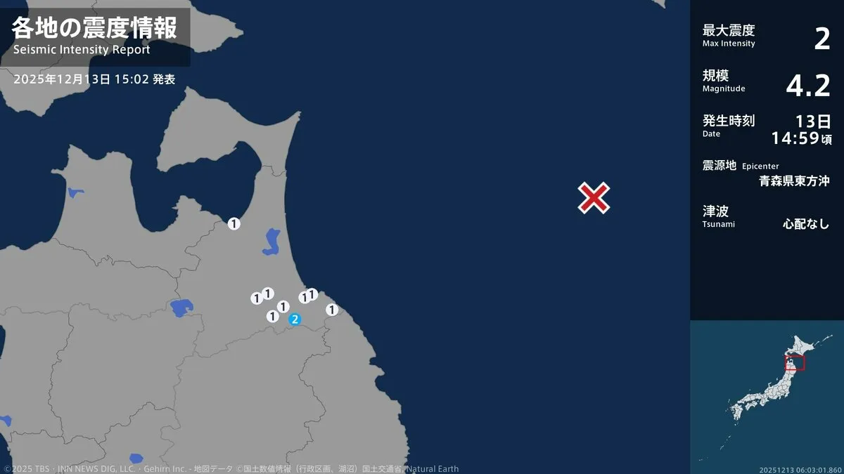 13日午後2時59分ごろ、青森県で最大震度2を観測する地震がありました。