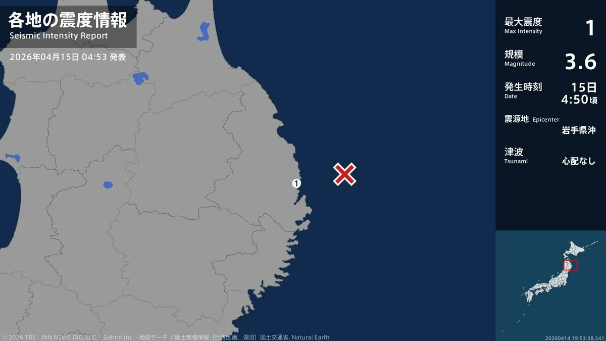 15日午前4時50分ごろ、岩手県で最大震度1を観測する地震がありました。